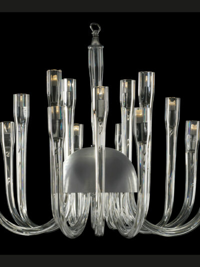 Ein geradliniges, klares und doch raffiniertes Design, ein zeitgenössischer Kronleuchter mit einer stilistischen Handschrift, die ihre Anziehungskraft im Laufe der Zeit beibehalten wird. Ein Kronleuchter aus Muranoglas mit handgefertigten Lampenschirmen, das optimale Modell für Hotel- oder Objektausstattungslösungen für große prestigeträchtige Strukturen, bei denen ein hohes ästhetisches Ergebnis und gleichzeitig eine breite Palette von Kataloglösungen erforderlich ist.