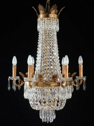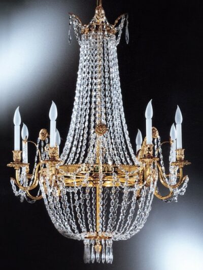Hier sehen Sie einen eleganten Empire Lüster, handgefertigt von unseren Kronleuchter Partnern und bestehend aus den hochwertigsten Materialien. Dieser traditionelle Leuchter eignet sich hervorragend für ein stilvolles Ambiente. Ein Rahmen aus 24 Karat Gold trägt die 12 verdeckten Lichter sowie die funkelnden Swarovski Kristallketten und -anhänger. Durch den breiteren Gold-Ring in der unteren Mitte, können die Swarovski Kristalle ihre volle Leucht- und Glitzerkraft entfalten und ziehen jeden Betrachter in ihren Bann. Weitere Leuchter aus der Kollektion „6610 Prestige“ sind in verschiedenen Größen sowie mit Vollschliff Kristallen erhältlich. Bitte kontaktieren Sie uns bei Fragen, Wünschen oder für mehr Details. Gerne heißen wir Sie auch in unserem Showroom in Hamburg willkommen. Anzahl der Glühbirnen: 4 x E14, 8 x E27