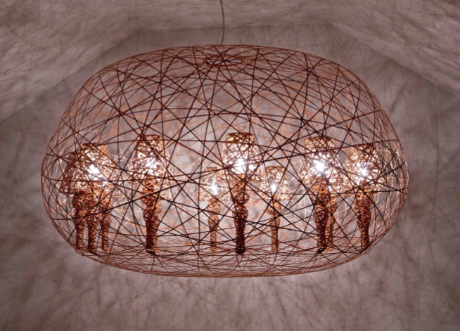 Überraschen Sie Ihre Freunde und Gäste mit einem modernen Kronleuchter, bei dem die Lichter nicht an einem zentralen Metallrahmen befestigt sind, sondern in einer größeren transparenten Kugel zu schweben scheinen. Wie bleiben die Lampenschirme aufrecht, wenn sie mit nur wenigen Bändern mit der Kugel verbunden sind? Wo sind die elektrischen Drähte, die die Glühbirnen speisen? Wie kann ein so leichter Kronleuchter von nur 2,90 kg seine Form behalten? Die Antwort liegt in den innovativen Handwerkstechniken, mit denen das Hightech-Material Kohlefaser beherrscht wird.