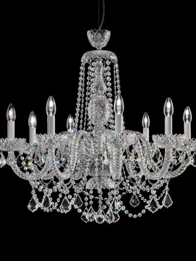 Ein Kronleuchter aus schwarz geschnitztem Glas, Metallstruktur mit einer Eisen-graue Oberfläche, schwarzen Stofftönen und Swarovski Elementen. Er ist verfügbar in unterschiedlichen Farben und Größen.