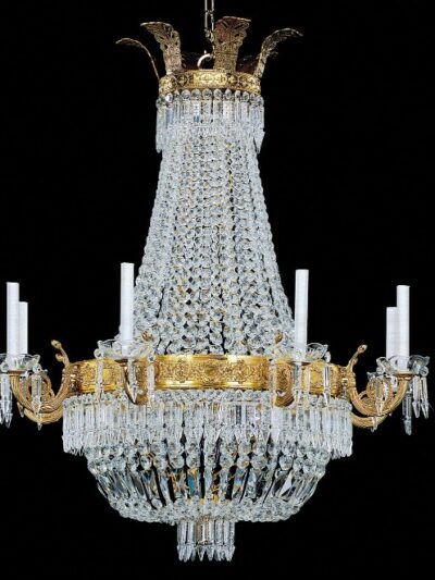 Hier sehen Sie einen eleganten Empire Lüster, handgefertigt von unseren Kronleuchter Partnern und bestehend aus den hochwertigsten Materialien. Dieser traditionelle Leuchter eignet sich hervorragend für ein stilvolles Ambiente. Ein Rahmen aus 24 Karat Gold trägt die 12 verdeckten Lichter sowie die funkelnden Swarovski Kristallketten und -anhänger. Durch den breiteren Gold-Ring in der unteren Mitte, können die Swarovski Kristalle ihre volle Leucht- und Glitzerkraft entfalten und ziehen jeden Betrachter in ihren Bann. Weitere Leuchter aus der Kollektion „6610 Prestige“ sind in verschiedenen Größen sowie mit Vollschliff Kristallen erhältlich. Bitte kontaktieren Sie uns bei Fragen, Wünschen oder für mehr Details. Gerne heißen wir Sie auch in unserem Showroom in Hamburg willkommen. Anzahl der Glühbirnen: 4 x E14, 8 x E27