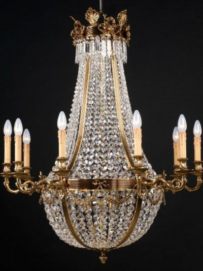 Hier sehen Sie einen umwerfenden, leicht verspielten Empire Kristall Lüster, der sich perfekt für Hotels und/oder Ballsäle eignet. Dieses imposante Meisterwerk wurde eigens für unsere Kunden von unseren österreichischen Partnern handgefertigt. Wir garantieren hochwertigste Materialien und beste Verarbeitung. Ein Rahmen aus 24 Karat Gold trägt den Kristallkettenvorhang und die handgeschliffenen Kristallanhänger. Die Rundbögen in der Mitte des Kronleuchters bringen Schwung und Leichtigkeit in das Design. Lassen Sie sich verzaubern. Gegen Aufpreis ist das Model „6715 Prestige“ auch mit Swarovski Kristallen erhältlich. Bitte kontaktieren Sie uns bei Fragen oder Wünschen. Wir helfen Ihnen gerne. Besuchen Sie uns auch gerne in unserem Showroom in Hamburg.