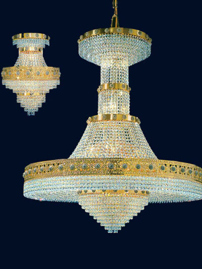 Unsere österreichischen Partnern haben diesen Luxus Empire Kronleuchter aus den hochwertigsten Materialien handgefertigt. Klassische Eleganz vereint sich mit purem Luxus, ohne dabei aufdringlich zu wirken. Der Leuchter eignet sich besonders gut für Hotels, Hohe Räume und Säle. Ein Rahmen aus 24 Karat Gold trägt die unterschiedlich großen handgeschliffenen Kristalle. Am oberen Rand sind länglichere Kristalle befestigt als in der Mitte. Außerdem befinden sich ausgelagerte Wipfelanhänger an den Seiten des Lüsters. So entstehen sagenhafte Lichteffekte. Gegen Aufpreis ist das Model „6935 Prestige“ auch mit Swarovski Kristallen erhältlich. Bitte kontaktieren Sie uns bei Fragen, Wünschen oder für mehr Details. Wir helfen Ihnen gerne. Besuchen Sie uns gerne in unserem Showroom in Hamburg.