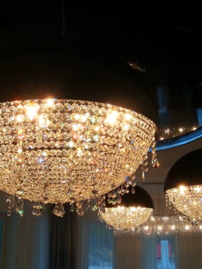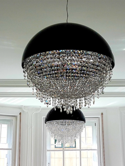 Luxurious design and a dazzling light is offered by this wonderful ceiling light from the „Iceberg“ collection, handmade in Hungary. As its name would suggest, this 4 light ceiling light is inspired by icebergs. The stainless steel frame is adorned with a curtain of shimmering crystals that create remarkable light effects. We offer a range of lighting from the „Iceberg“ collection. Please do not hesitate to contact us for more information or details. Size Depth: 30 cm Diameter: 60 cm Number of Bulbs: 4 pieces