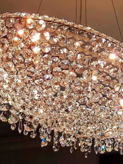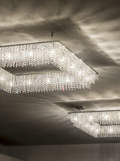 LINEA RAIN ist der perfekte Kristallleuchter über den Tisch. Die glitzernen Kristalle und kleinen Leuchten, sehen wie glitzerne Regentropfen aus und machen eine traumhafte Ambiante im Raum.
