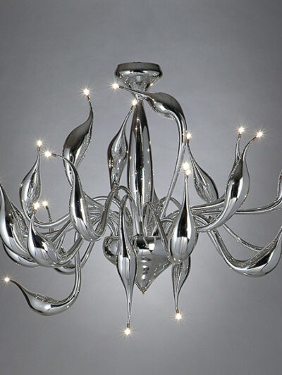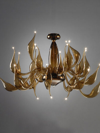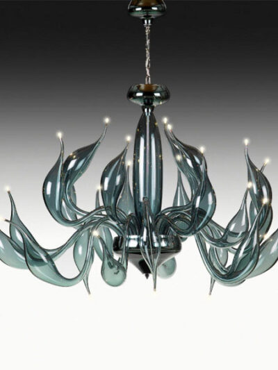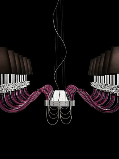 Hier sehen Sie einen absolut atemberaubenden Murano Kronleuchter, handgefertigt von dem talentierten Künstler Fabio Fornasier. Dieser junge und hochtalentierte Glasbläser folgt der Familientradition der Glasbläserei und erfindet seine Meisterwerke dennoch immer wieder neu. Er verbindet Tradition und hochwertige Qualität mit neuen, spannenden Designs. Der Kronleuchter ist in einem modernen Violett gehalten und besitzt sagenhafte 63 Lichter, die für wundervolle Lichtreflexe sorgen, die selbst ein Sternenhimmel nicht übertreffen kann. Die Lichter werden von geschwungenen und verdrehten Muranoglas Armen gehalten und sind auf einer hochwertigen Metallstruktur angebracht. Jeder Kronleuchter ist ein individueller Blickfang. Dieses Modell ist besonders gut für Hotels, Bars, Restaurants oder Privaträume geeignet, in denen der Kronleuchter seine Wirkung entfalten kann. Überzeugen Sie sich selbst von der Eleganz und Magie eines Murano Kunst Kronleuchters von Fabio Fornasier und besuchen Sie unseren Showroom, in dem Sie neben eines Kunstwerks von Fornasier weitere Lüster bestaunen können! Bitte kontaktieren Sie uns bei Fragen und für weitere Details. Wir helfen Ihnen gerne. Länge: 220 cm