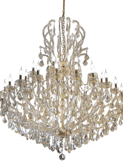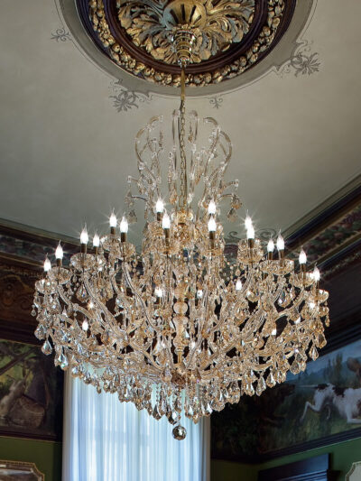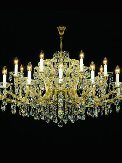 Umwerfende Eleganz bringt Ihnen dieser 10+5 Licht Maria Theresia Kronleuchter, der von unseren österreichischen Partnern handgefertigt wurde. Auf 2 Ebenen verteilen sich die 15 Lichter, die von einem Rahmen aus 24 Karat Gold gehalten werden. Die Arme sind stilvoll geschwungen. Geschmückt ist dieser Lüster mit fabelhaften Swarovski Kristallketten und handgeschliffenen Kristallanhängern. Es entstehen magische Lichteffekte, die Sie zum Staunen bringen werden. Das Modell „3433 Elegance“ ist auch mit Vollschliff Kristallen erhältlich. Andere Lampen und Rahmenausführungen sind verfügbar. Bitte kontaktieren Sie uns bei Fragen, Wünschen oder für mehr Details. Wir helfen Ihnen gerne. Kommen Sie gerne zu einem persönlichen Beratungsgespräch in unserem Showroom in Hamburg vorbei.