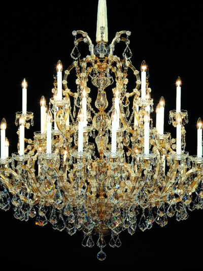 Ein handgefertigter Maria Theresia Lüster unserer österreichischen Partner aus hochwertigen Materialien.,Dieses opulente Meisterwerk mit einem Rahmen aus 24 Karat Gold ist ein optisches Highlight. Die 24 Lampen sind in zwei Reihen (16+8) auf unterschiedlichen Höhen angeordnet und beleuchten die Anhänger und Details aus Vollschliff Kristall so, dass ein Funkeln Ihren Raum erhellen wird. Das Modell „3536 Elegance“ ist gegen Aufpreis auch mit Swarovski Kristallen erhältlich. Bitte kontaktieren Sie uns, wenn Sie noch weitere Fragen oder Wünsche haben. Lassen Sie sich auch gerne bei einem persönlichen Gespräch in unserem Showroom in Hamburg beraten.