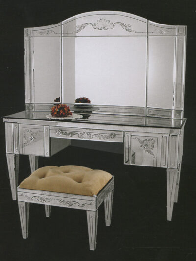 This commode is a match to mirror V2167 and follows the same design patterns. It has a plain Murano mirror glass top, four central drawers and two doors to either side of the set of drawers. All surfaces are covered with Murano mirror glass, including the legs. The doors curve slightly forward and are decorated with the same simple medallion applications as mirror V2167. The drawers are lined with beige velvet. While in combination with the mirror this commode makes a splendid pair, it stands well on its own. All Murano furniture is handcrafted from finest materials and Murano glass by the master craftsmen of Murano, near Venice. The furniture is made to order and to exceptional standards. If you would like any more information please do not hesitate to contact us. Dimensions: 155cm x 60cm x 89cm Delivery Time: 8 Weeks