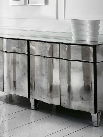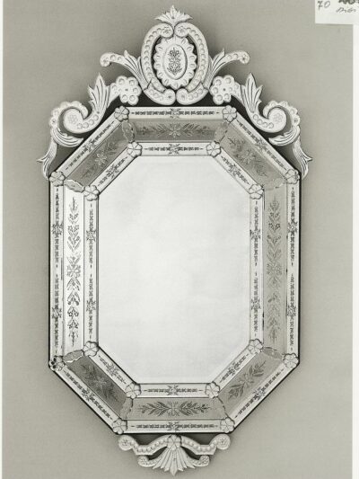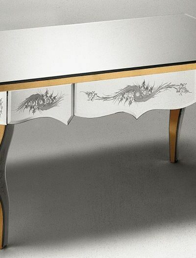 The mirrored glass of this console is etched with a number of intricate flowers and ornaments. In addition there are some gold details which give the table an elegant appearance.All Murano furniture is handcrafted from finest materials and Murano glass by the Mastercraftsmen of Murano, near Venice. The furniture is made to order and to exceptional standards.We are happy to help you with personal wishes and questions. Please contact us. Table Dimensions: 157cm x 50cm x 76cm, Mirror Dimensions: 150cm x 90cm,Chair Dimensions: 56cm x 56cm x 46cmDelivery Time: 8 Weeks