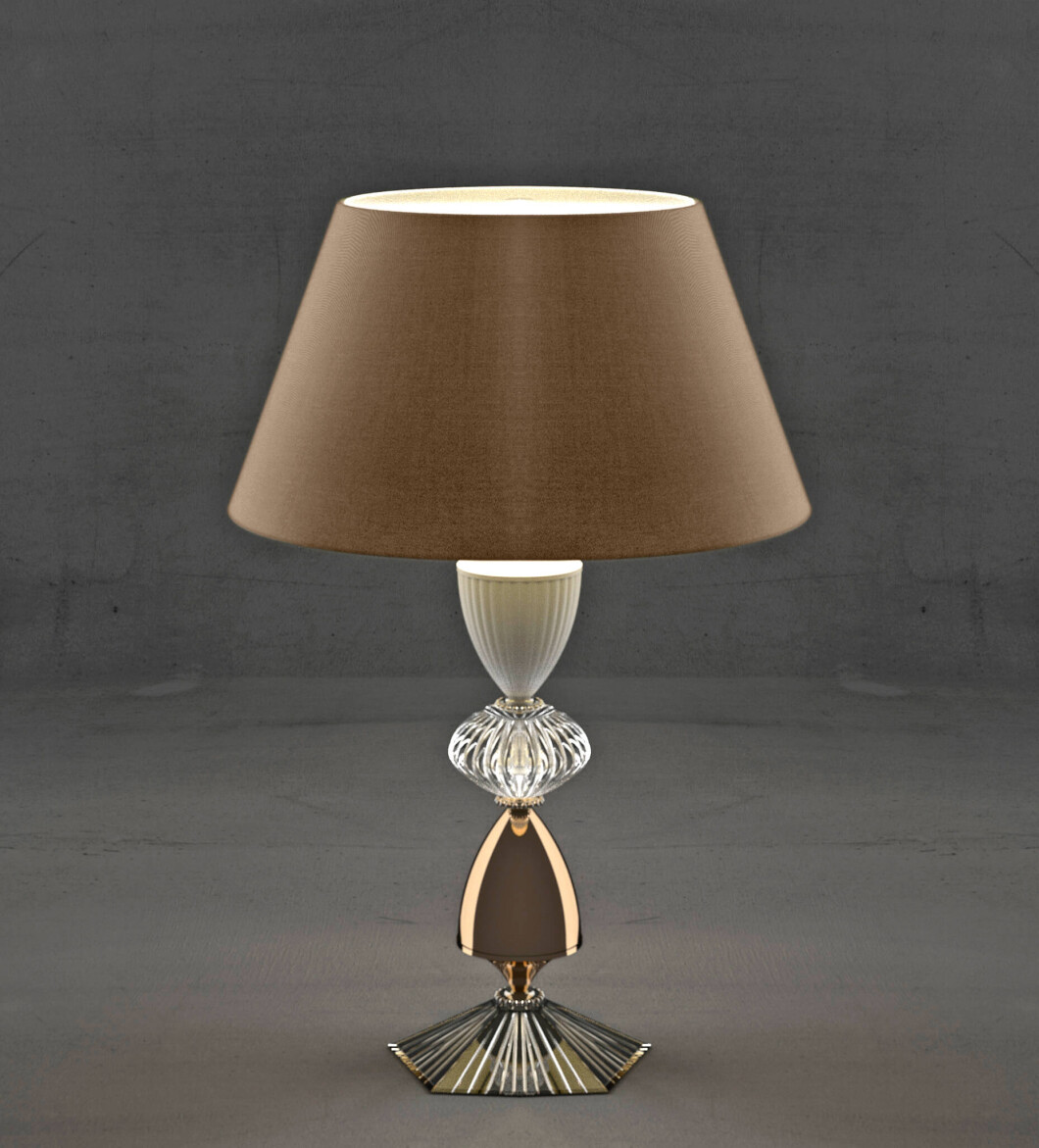 Stehleuchte in transparentem und Teak geschnitztem Kristall. Metall mit weißer, Gold-Nickel und Nickel-Ausführungen.