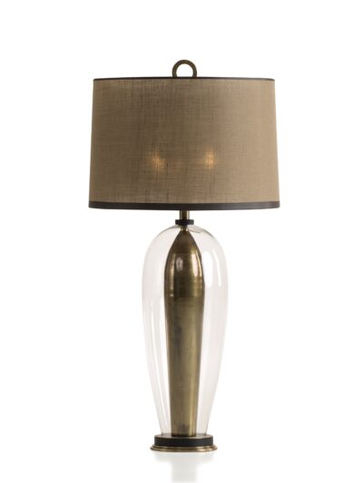 Tischleuchte aus Metall mit Gold-Nickel-Finish, geschnitztem klaren und Teak-Kristall und taubenfarbenem Stoffschirm. Erhältlich in verschiedenen Farben.