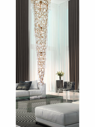 Inspiriert von der Form des Wassers und des Dampfes in einem natürlichen Geysir, verbindet diese Kollektion Aggressivität und Schönheit in einer unwahrscheinlichen Harmonie zwischen Stärke und Zerbrechlichkeit und bildet die Grundlage der Geyser Collection. Die Vorrangstellung des Glases in diesem reichen Design verkörpert das Stück mit Kraft und Energie. Optisch beeindruckend, vermittelt das Design Erhabenheit und erreicht den Status einer beleuchteten Skulptur.