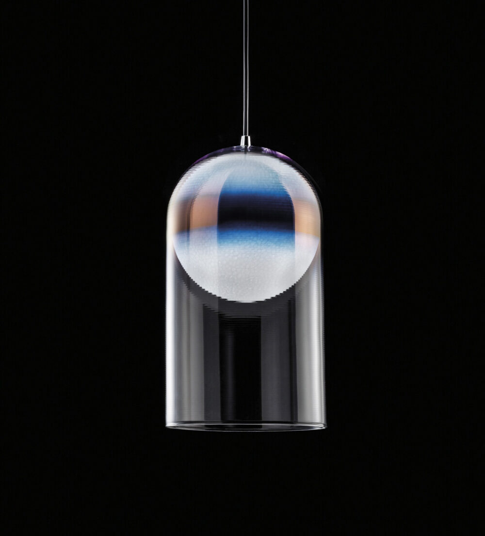 Hängeleuchte mit geblasenem weißem Glas in einer klaren Kuppel mit kupferfarbener Oberfläche. Struktur aus verchromtem Metall. In verschiedenen Ausführungen erhältlich.
