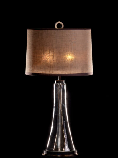 Tischleuchte aus geschliffenem Kristall mit internem Diffusor aus geblasenem und satiniertem Glas. Sockel aus Metall in den Ausführungen Champagner matt, Bronze matt oder Schwarz matt.