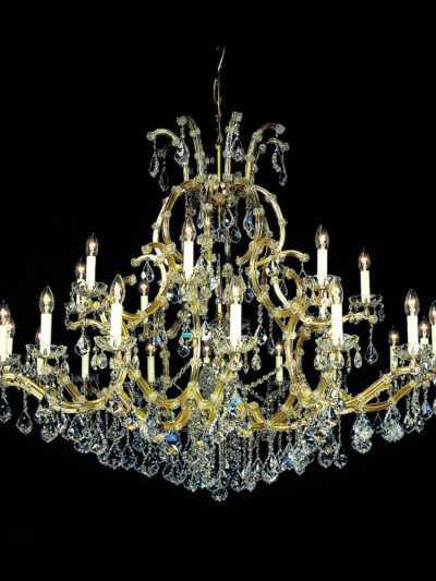 Ein schöner Maria Theresia Kronleuchter, handgefertigt aus böhmischen Kristallen. In zwei verschiedenen Farben erhältlich: klar und amber. Wir garantieren erstklassige Qualität und hochwertigste Verarbeitung. Für weitere Details, bei Fragen oder Wünschen kontaktieren Sie uns bitte. Wir beraten Sie gerne.