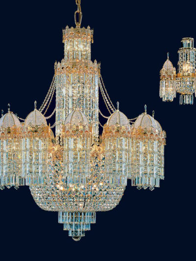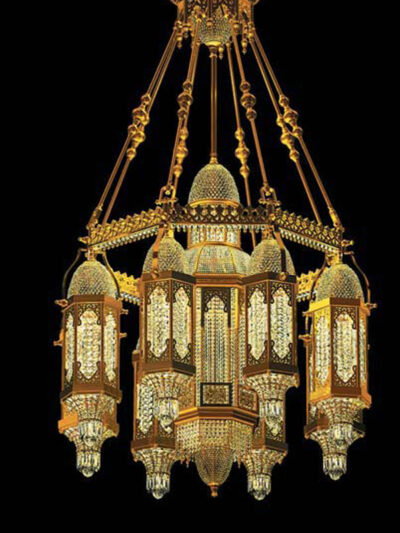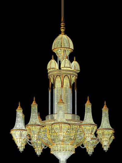 Ein imposanter Orient Korblüster mit einem Durchmesser von 120 cm. Aufgrund seiner Größe ist dieser Kronleuchter ideal für hohe Räume oder Hotels. Er wurde von unseren Partnern handgefertigt und besteht aus den besten Materialien. Der runde Rahmen besteht aus vergoldetem Metall. Bei den Kristallen handelt es sich um Vollschliff Kristalle. Swarovski Kristalle sind gegen Aufpreis erhältlich. Die Lichter sind kreisförmig angeordnet und erzeugen so funkelnde Lichteffekte. Weitere Lampen dieser Kollektion sind verfügbar. Bitte kontaktieren Sie uns bei Fragen, Wünschen oder für mehr Details. Wir heißen Sie gerne in unserem Showroom in Hamburg willkommen.