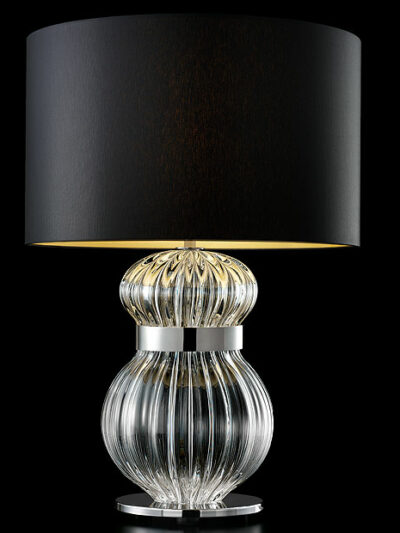 A table lamp that is characterized by the crystal rostral, like the homonymous chandelier of which it is natural complement. This table lamp comes in various colors and you can also choose from different shades. Please do not hesitate to contact us for any questions of yours. Catalogue: S Designer: Barovier&Toso Year: 2006 Available colors: crystal, grey, light pink, liquid orange, caramel, violet Shades: white, black, brown