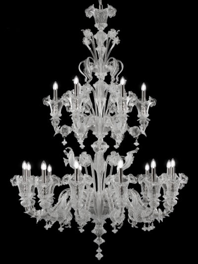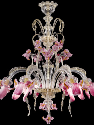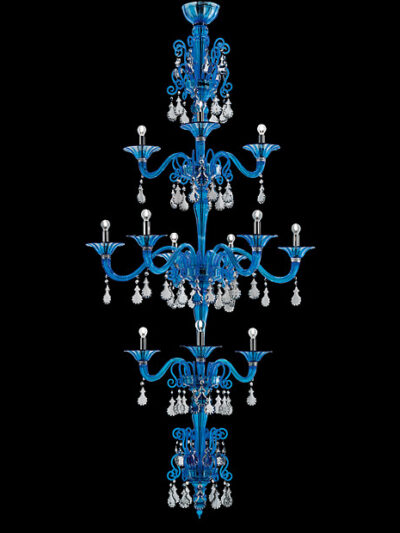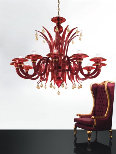 A simple, highly adaptable, elegant chandelier handcrafted by skilled glassmakers. The number of configurations for this piece is truly amazing, making it the perfect choice for designers. Available with silk lampshades or highly ornate glass details.