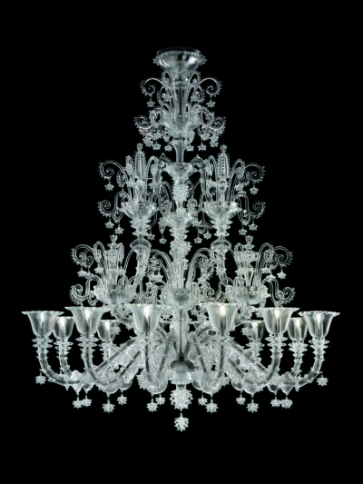 This beautiful Murano chandelier has been handmade by the glassblowers of the famous island Murano. It consists of crystal glass with white and green floral decorations. The chandelier has got a "spring style".Other sizes and colours are available. Please contact us for information.