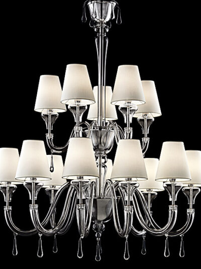 This beautiful modern 12-armed chandelier is manufactured from the finest and oldest glassblowers on Murano in Italy. The TamTam chandelier von Barovier&Toso comes in various sizes and colors and you can also choose from different shades.. We are happy to assist you with any questions or requests.