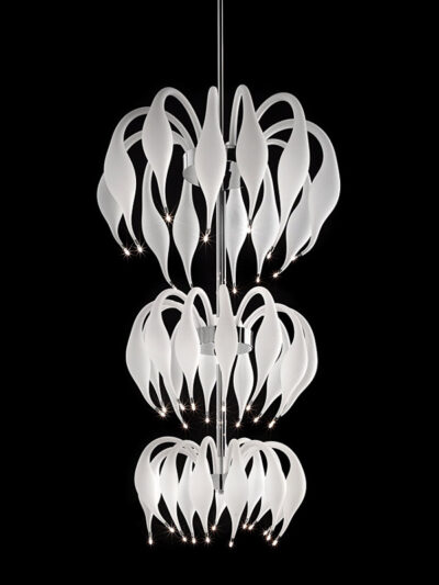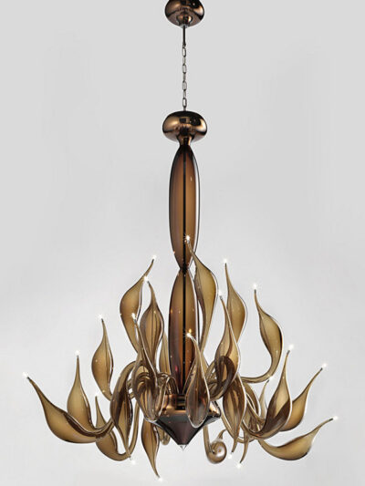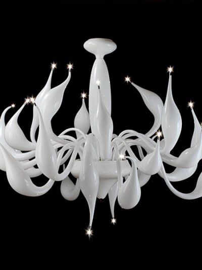 Here you can see a stylish masterpiece: A design chandelier from the talented glassblower Fabio Fornasier. The 18 light chandelier comes in an exciting purple/violet. The lights are carried by the twisted Murano glass arms.,Fabio Fornasier was born in 1963 in Venice and followed the family tradition of the art of glass blowing. His passion for the manufacture of glass made him become a master of the chandeliers at an early age . Together with his brother Roberto, he leads a small but graceful factory in the heart of the island, in which they produce the finest chandeliers in the world. Fabio’s talent reaches so far that he is one of the main teachers of the University of glassblowing "Scuola del Vetro Abate Zanetti".,This model is also available with 24 or 36 lights and in many wonderful colours. Please contact us for further details.