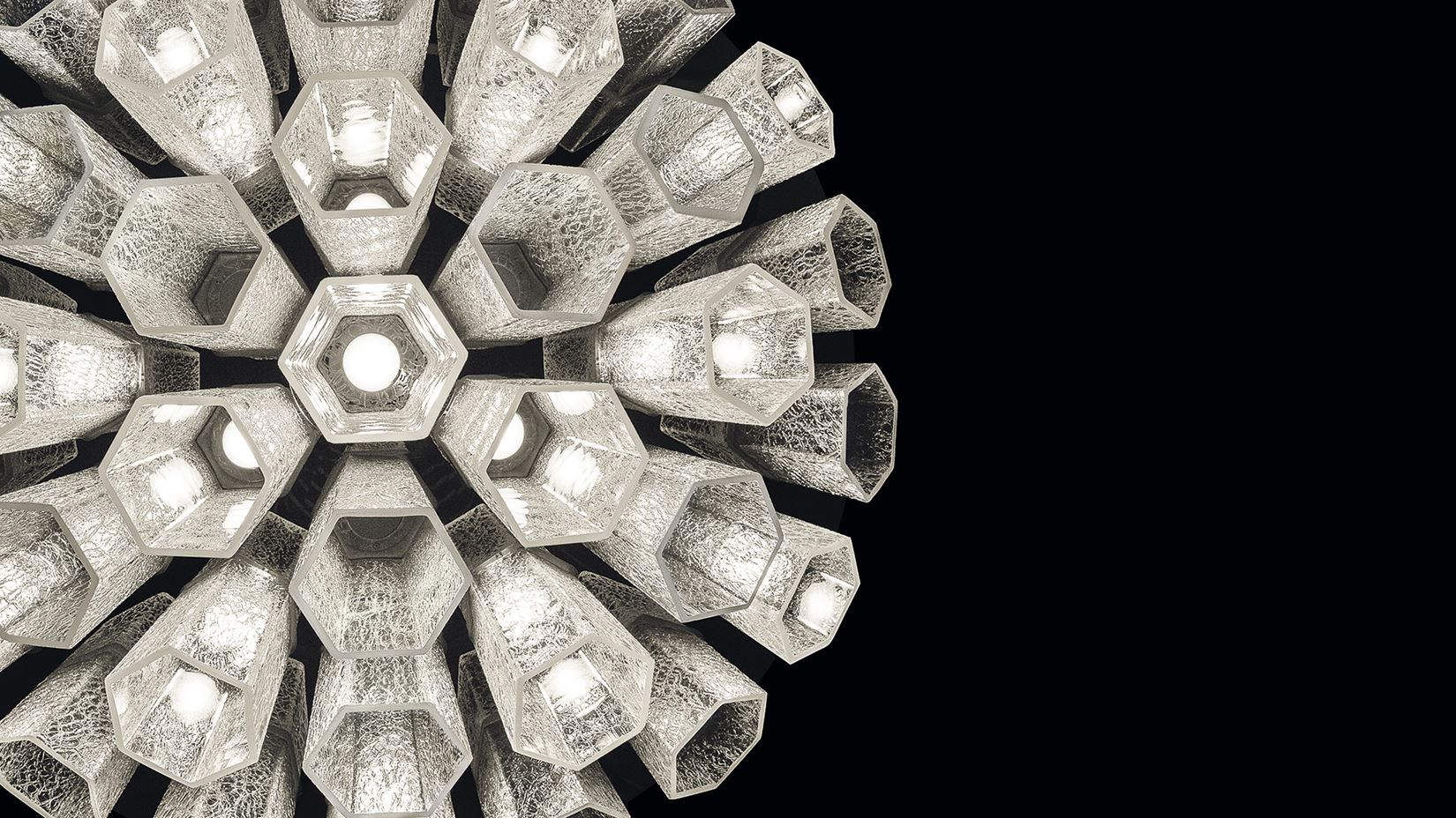 The collection builds on the archive of large installations made by Barovier&Toso in the 1960s and 1970s, multiplying and repeating modular parts, simple or polyhedral, smooth or enhanced by traditional Murano workmanship. The hexagonal tube made with the age-old “ice” technique generates spherical volumes that fit perfectly into the architecture of spaces, almost becoming its extension. According to your own creativity, the position of the modules can be customized during installation into a symmetrical and conventional order or into a messy shape.