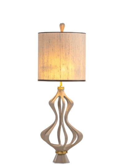 The collection “Avaria” combines natural forms with organic elements in a contemporary design. On this picture you can see a table lamp in a feminine style that combines the high standards of a handmade lamp design: Designed and handmade by our Dutch partners in order to create an exclusive elegant table lamp. The frame is cast in metal and held in beautiful Dutch Silver. The lamp base is designed ultra-slim and looks very delicate. The highlight is the hand-made women’s body, which is integrated into the frame and is an eye-catcher of the extravagant way. The fabric shade is black, which is a nice contrast to the silver frame. Other lamps and chandeliers from the collection “Avaria” are available in various sizes and shapes. Please contact us for any questions or for more information. Monday through Saturday we are also in person at our showroom in Hamburg. Height: 87 cm, Width: 30 cm, Number of bulbs: 2 x E14, max. 40 Watt