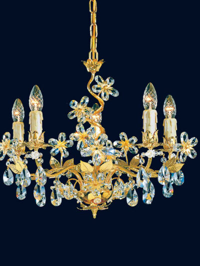 A fine gold-crystal ceiling lamp with beautiful blue crystal pendants. This small chandelier fits beautifully into a classic ambience. It consists of a gold frame and first class full-cut crystals. For an extra charge Swarovski crystals are also available. The special highlight are the fine blue crystal pendants.Other chandeliers of this collection are available. Please contact us for your questions, requests or for more details. We’re here to help.