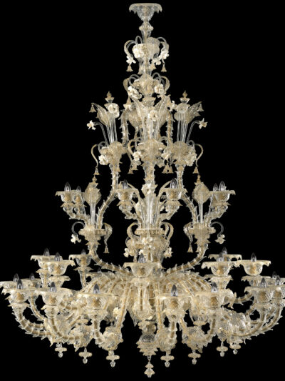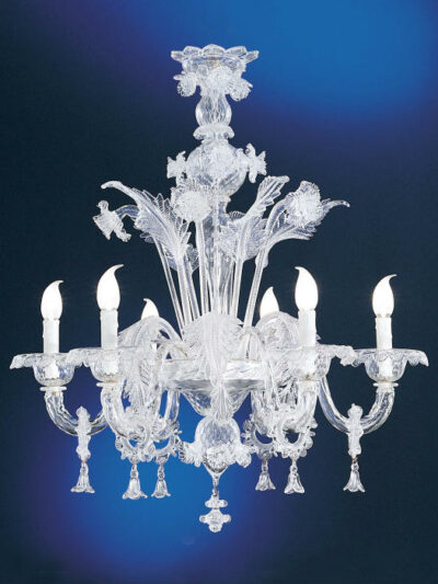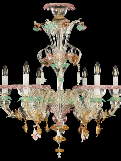 This beautiful Murano chandelier has been handmade by the glassblowers of the famous island Murano. It consists of crystal glass with white and green floral decorations. The chandelier has got a "spring style".Other sizes and colours are available. Please contact us for information.