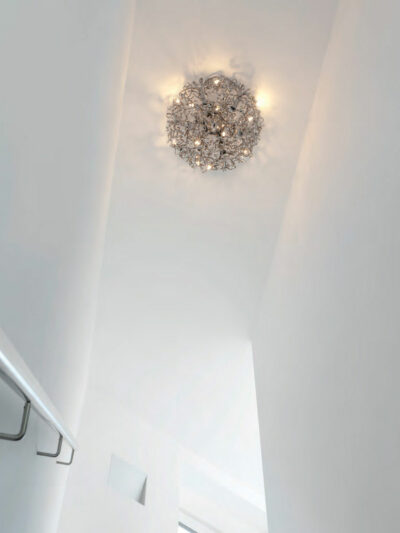 Whirls of hourglasses move in space with light, a dancing presence that crosses each part in Venetian Crystal, lined with the age-old Rigadin technique. Sinuously shaped, the hourglasses repeat and overlap, creating dense, elegant lamps based on drawings from the 1960s.