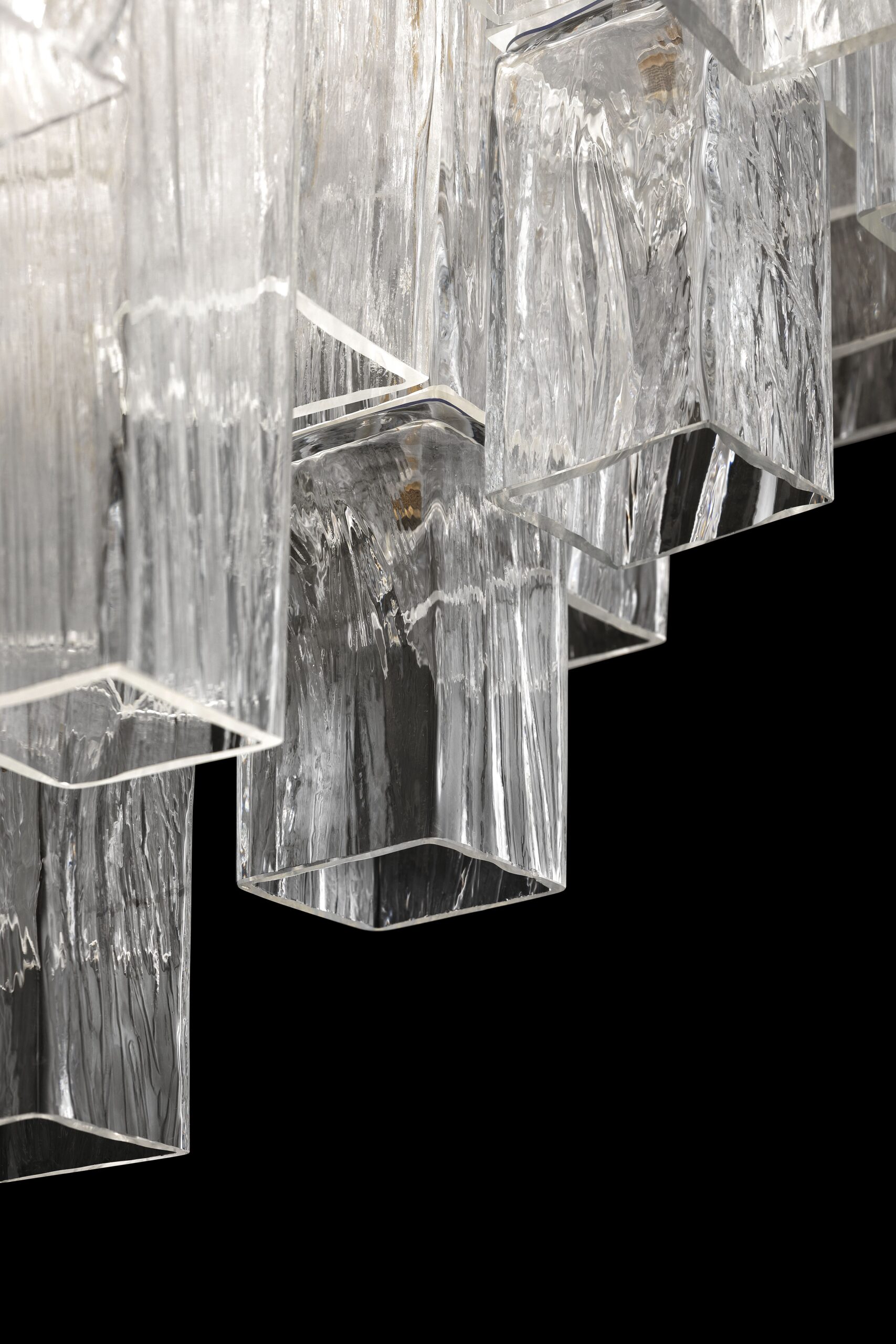 Forcefully three-dimensional, these pieces interact with the architecture of spaces, defining volumes and boundaries. The structure of the lamps is completely concealed, while tubes with a square cross-section descend from the ceiling. The compositions form asymmetrical overturned pyramids, based on the rigorous and energetic geometric shapes of Art Deco. The parts are overlaid and juxtaposed, with different lengths and a rhythmical alternation of colours in the polychrome versions. The a corteccia workmanship of the Venetian Crystal creates irregular variations on the surface and particular refractions of the light, for an overall effect of soft brightness punctuated by sparkling highlights.