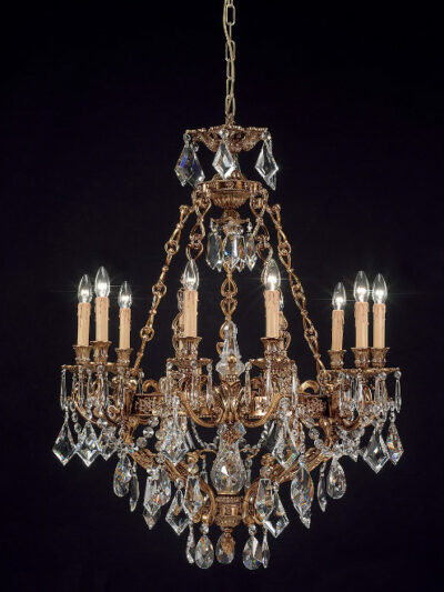 This chandelier is handmade in Florence, Italy, by experienced masters. It convinces with its beautifully curved arms and impressive golden frame with small decorations.