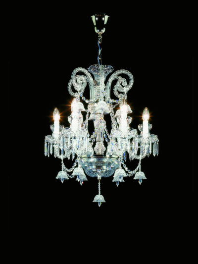 Pendant lamp in crystal or clear glass, chrome-plated metal frame and blown glass diffusers. Available in different dimensions.