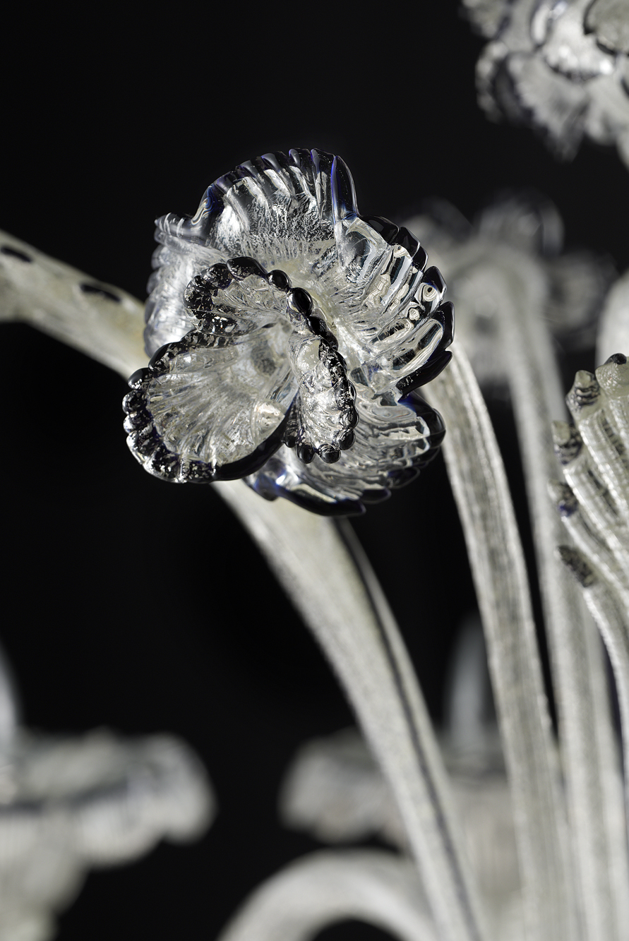 Silver chandelier with blue trimming. Handmade in Italy and available in various sizes and glass colours.