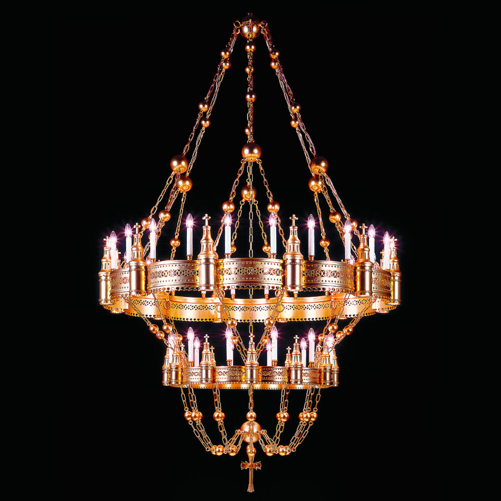 An extremely impressive metal hotel chandelier, which brings royal castles, endless ballroom nights and long forgotten times to mind. It is from the “9430-160 Impression” collection and was handmade in Austria. Due to its size, this impressive light is at its most sublime when displayed in ballrooms, hotels, or any room with a high ceiling, as this is where it can offer maximum lighting. A luxurious bronze frame in antique style carries 36 candle lights, which are distributed over 2 levels. They are arranged in 2 circles, thus guaranteing a maximum light experience. The masterpiece is decorated with little metal decorations. We offer a range of lighting from the “9430-160 Impression” collection. Please contact us for further information or details. We are happy to assist you.