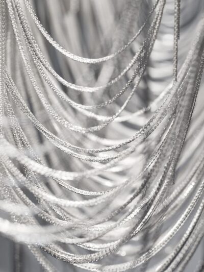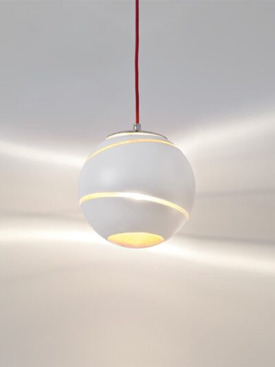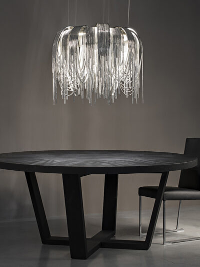 An extraordinary design by Nigel Coates for Terzani. With thirty-six Italian lead crystal angels in a base jumping pose hanging from a nickel ceiling base. This is the largest with the other sizes shown in the attached images (7, 19, 12, 18 and 24). The price shown is for the 18 piece hanging angels chandelier.