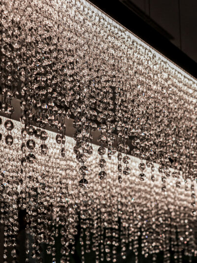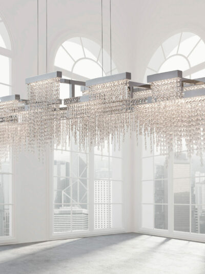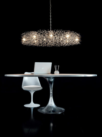 An elegant decomposition of the classic chandelier, reminiscent of the Nevada chandelier. Available in two sizes, with 8, 12 or 16 lights and with white or black lampshades, it has chromed metal parts and transparent electrical components. The height is adjustable.,This chandelier comes in various sizes, colors and you can also choose from different shades.,Please do not hesitate to contact us for any questions of yours., ,Catalogue: L,Designer: Franco Raggi,Year: 2007,Available colors: crystal, liquid citron, grey, aquamarine,Shades: white, black