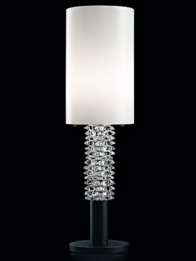 The design of the Babel lamp has a strong suggestive ability that does not go unnoticed. The satin-finished brass frame is enriched with cylindrical polished horn inserts, which create an effect of three-dimensionality and perspective. The lamp is topped by an ivory shantung lampshade with a Tosca leather border (cat. Super), dark brown color from which a light filters through, enhancing the warm nuances of the horn and naturally illuminating the surroundings.