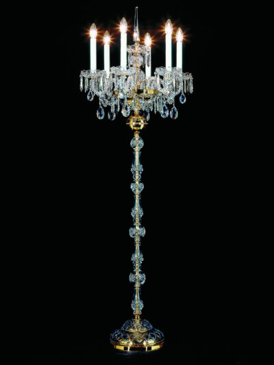 This illuminating floor lamp is suspended in brass rods and has two LED lights at each end of the glass. The lights shine through the crystal and illuminate a unique pattern throughout the room. Matching chandeliers can be found in the collection.We guarantee high quality. Please contact us for further details, questions or personal requests. We will be happy to help you.