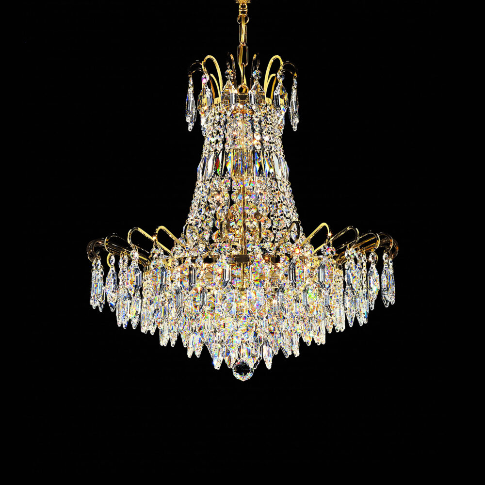 An ultra-glamorous chandelier that brings sparkle to any room its in, from the “4312 Lifestyle” collection. This 10 light chandelier features a high quality 24 carat gold frame, adorned with countless crystal chains and hand-sanded crystal pendants. The crystals come in a variety of lustrous colors and shades. We offer a range of chandeliers from the “4312 Lifestyle” collection. Please contact us for further information and assistance. Number of light bulbs: 10 x E14