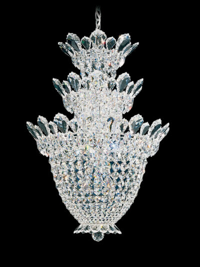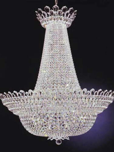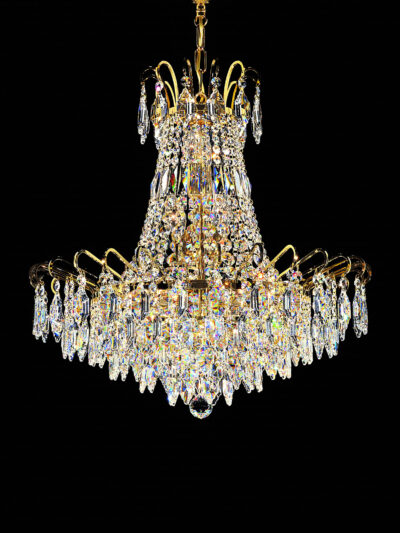 A regal crystal chandelier in empire style, perfectly suited for hotels and/or ballrooms, stemming from the “7250 Prestige” collection. Austrian designers created this impressive masterpiece from the finest materials. It features 16 lights on a lustrous 24 carat gold antique frame. The light is adorned with crystal chains and pendants that give the light personality and create astonishing light effects. We offer a range of lighting from the “7250 Prestige” collection. Please do not hesitate to contact us for further information or details. We are happy to assist you.