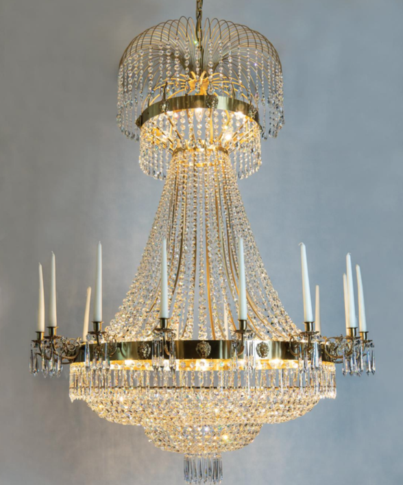 The Zimba model is a beautiful and spectacular crystal chandelier in Empire style, handmade by our Swedish partners. We guarantee first-class quality and the highest quality workmanship. Especially in combination with the hand-cut crystals in octagon, drop and almond shape, a stunning overall picture is created. It is a model with a frame in brass or cognac tone and either 21 or 24 light bulbs.
