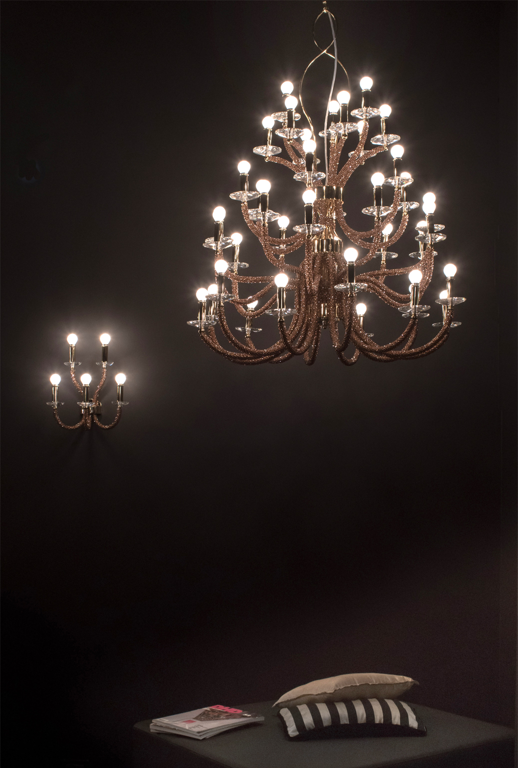 Die Inspiration für Moulin Rouge entstand fast zufällig durch einen unerwarteten Fund auf einem verstaubten Dachboden, der den Willen weckte, eine Lampe zu kreieren, die an alte Stile erinnert, aber auch in eine neue, glänzende Hülle gekleidet werden kann. Die metallische Struktur ist mit einer kontinuierlichen Linie von unregelmäßigen Perlen umhüllt, die von Expertenhänden einzeln eingesetzt und mit einigen in Murano handgefertigten Kristallnuggets angereichert wurden.