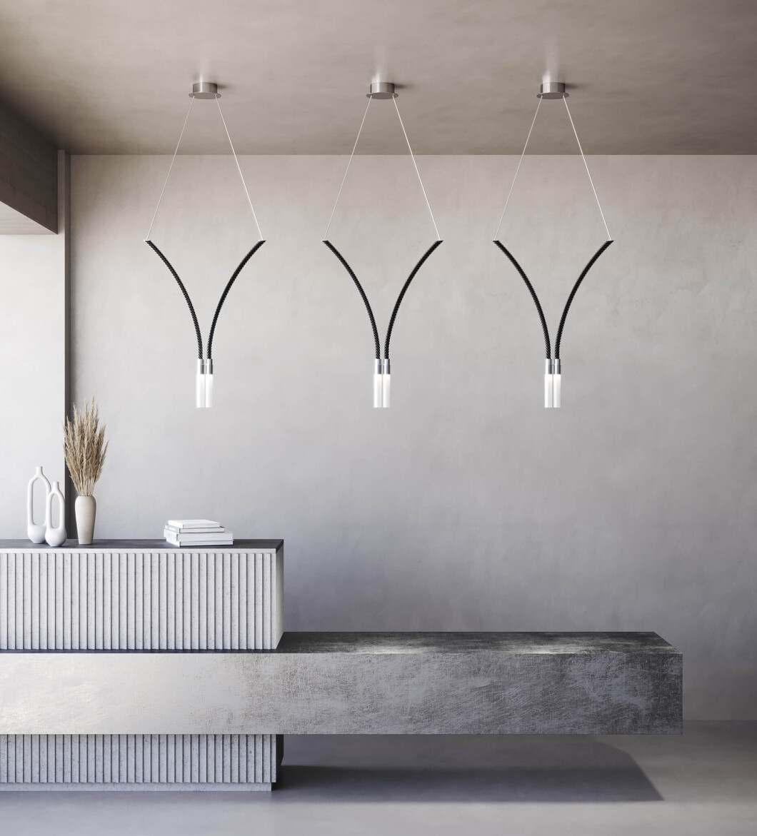 Handgefertigte „torchòn“-Glas-Hängeleuchte, in transparenten oder schwarzen Farben mit weißen Glasdiffusoren.